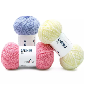 A Lã Carinho da marca Pingouin é um fio de tricô/crochê leve, macio e tradicional, feito especialmente para peças infantis ou de toque delicado.
